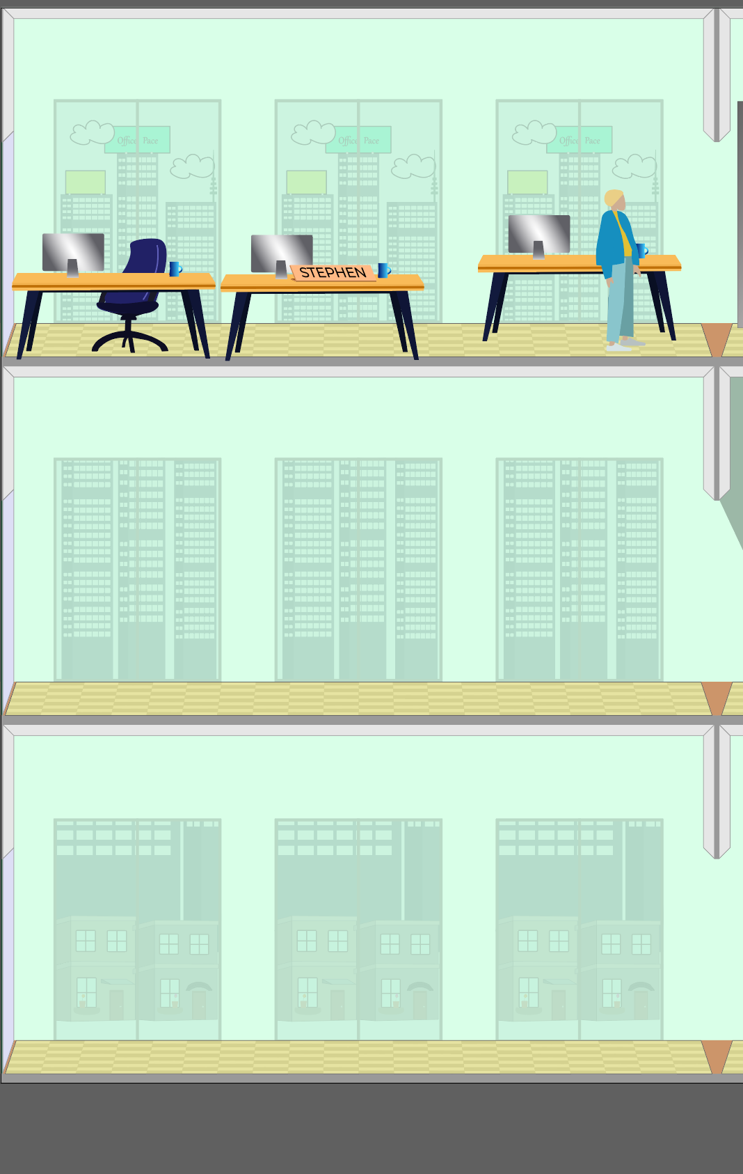Although it took a while, we finally landed on the idea of a speedrunner where the objective was simply to take advantage of company policy and get out of the office as fast as possible with no repercussions.
